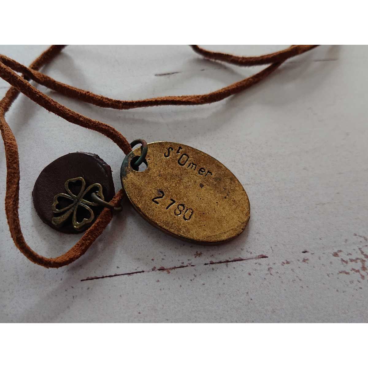 - □アンティーク感□Delcuppe Leon 1889 刻印□ゴールドカラープレート&四葉のクローバーモチーフのロングペンダント□