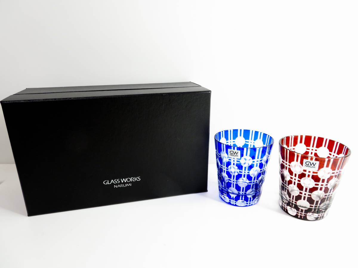 > 未使用品▲NARUMI ナルミ 鳴海製陶 GLASS WORKS ペアオールド エタニティー ペアグラス 2客セット 色違い 赤 青 箱あり 管理2007 U-5