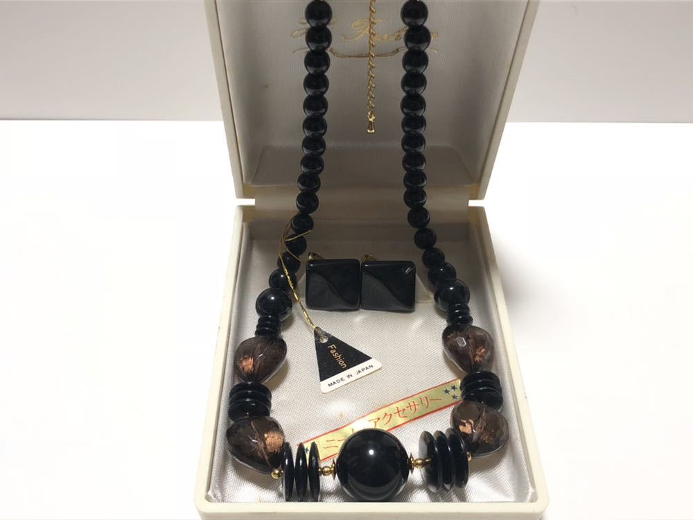 - 樹脂 ビーズ ブラックカラー デザイン ペンダントネックレス&イヤリング 未使用 美品 ケース付属