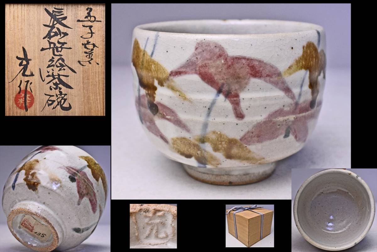 > 木村充 ★ 辰砂 笹絵 茶碗 ★ 共箱 ★ 益子焼 ★ 木村一郎 木村充良 縁 ★ 茶道具 ★ 物故作家 ★