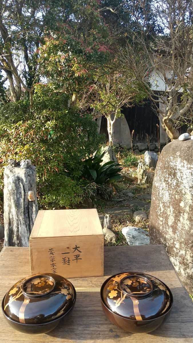 - 桜意匠蒔絵 大平(大きく平らな椀) 二個組 木箱有り 和の演出素材 螺鈿 漆器 民具