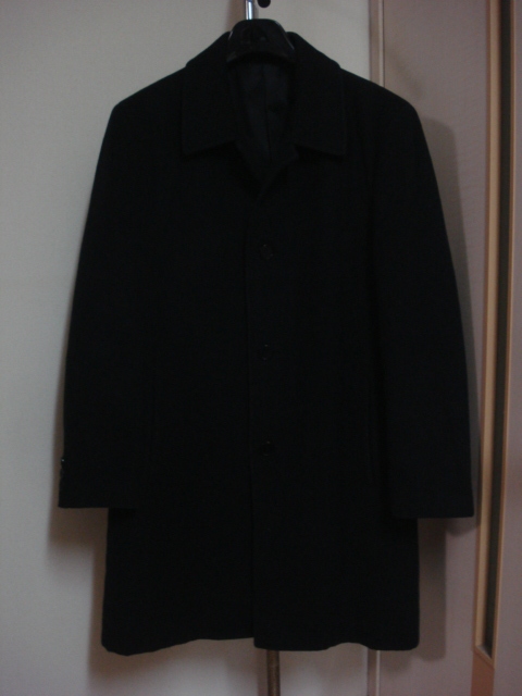- 格安カシミヤ混紡素材かっこいい・COMME CA ISM(コムサイズム)・黒~濃紺系地トラッド系モデル・ 高級ステンカラーコート L 通勤用等