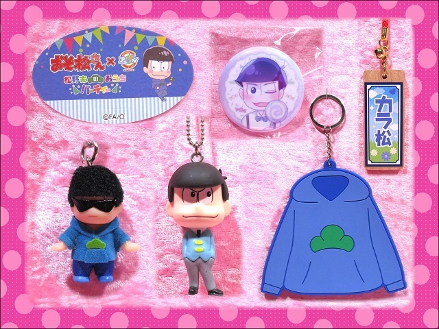 > おそ松さん カラ松 セット 6点 ★ キューピー・パーカー型キーホルダー・スイング・缶バッチ・木札ストラップ・アニON タグ