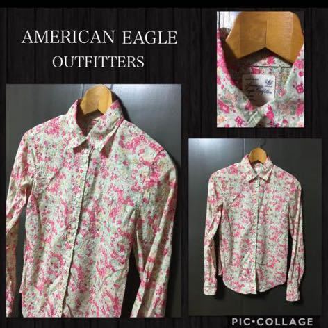 > ◆American Eagle Outfitters アメリカンイーグル アウトフィッターズ 長袖シャツ ワンポイント刺繍入 花柄 薄手 レディースXS 美品