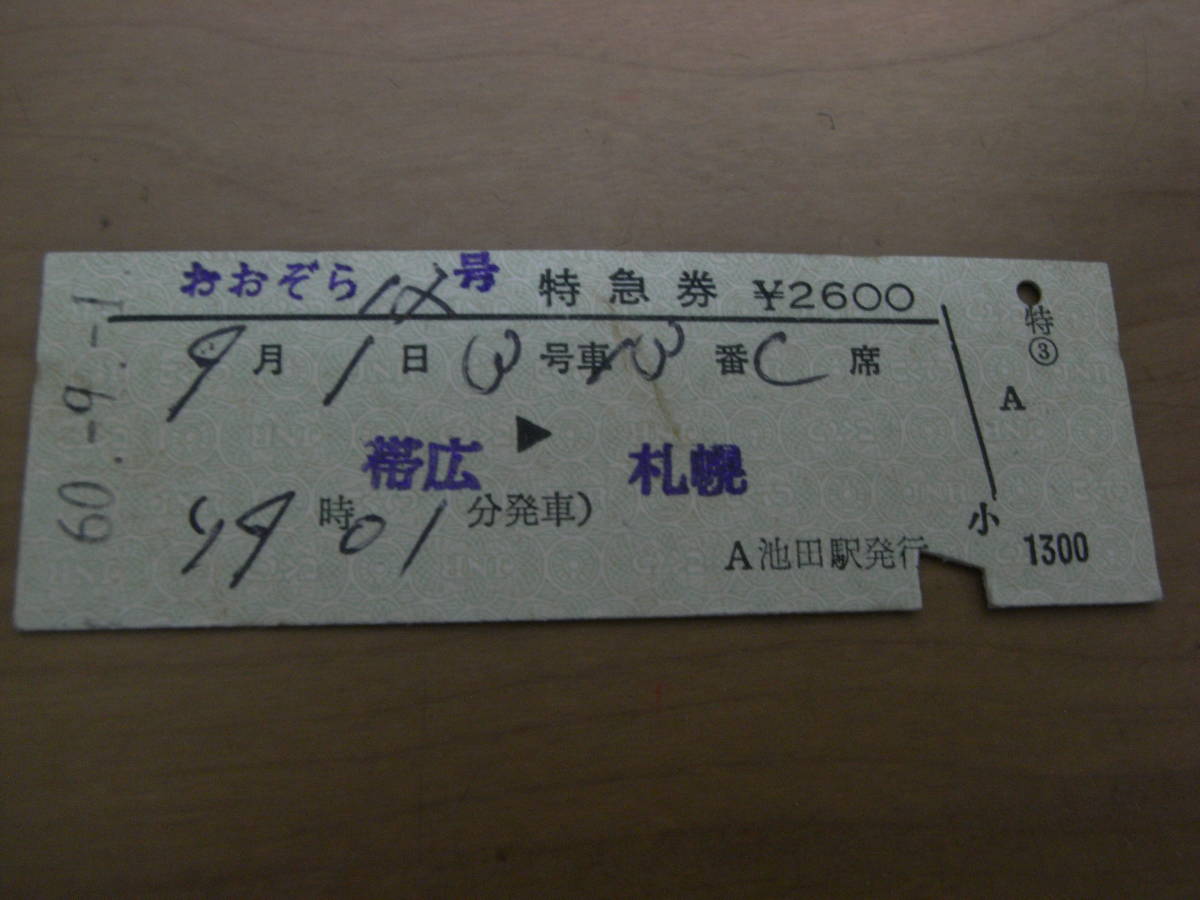 - おおぞら12号 特急券 帯広→札幌 昭和60年9月1日発行 池田駅発行