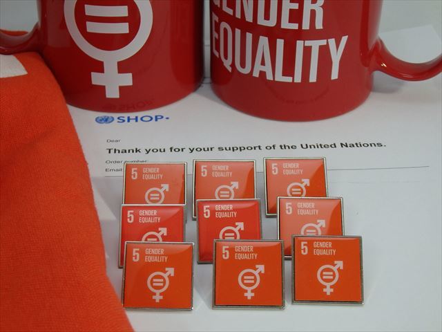 > (国連ブックショップ購入・送料無料)SDGsピンバッジ 9個(5: ジェンダー平等の実現 ・ジェンダーイコール(ラバークラスプ再生素材)UN71