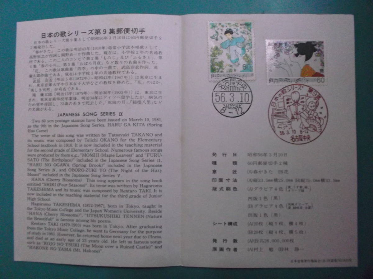> お選び下さい(①~⑨の内)記念印押印切手①歌S9②建築2③国際切手④近代美術9⑤歌S8⑥神戸ポート博⑦農林水産⑧国土緑化56⑨趣味週間56