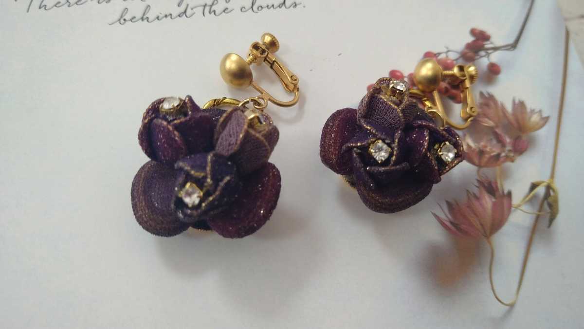 - □紫お花コサージュ×ラインストーン&ラメ・イヤリング□