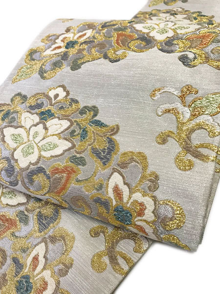 - 袋帯 平等院鳳凰堂木彫金唐草 京都西陣織袋帯No.2293 廣部商事謹製 シルバー 未仕立て 袋帯 訪問着 色無地 留袖 送料無料