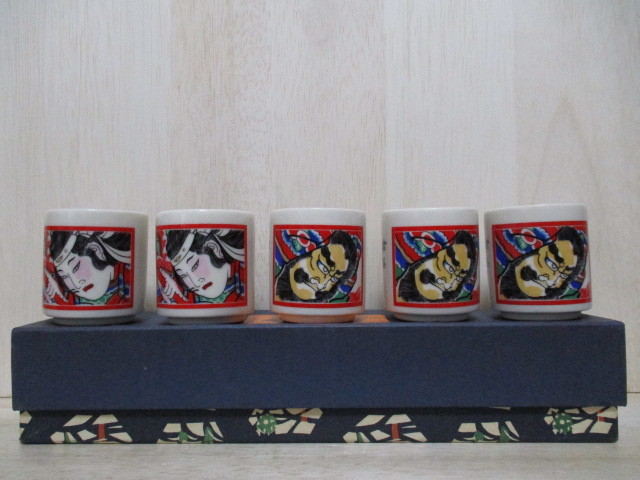 - N78-12S おちょこ ぐいのみ 5客 津軽ねぶた柄 陶器 2種類 中古 高さ約4.6cm (1-中)