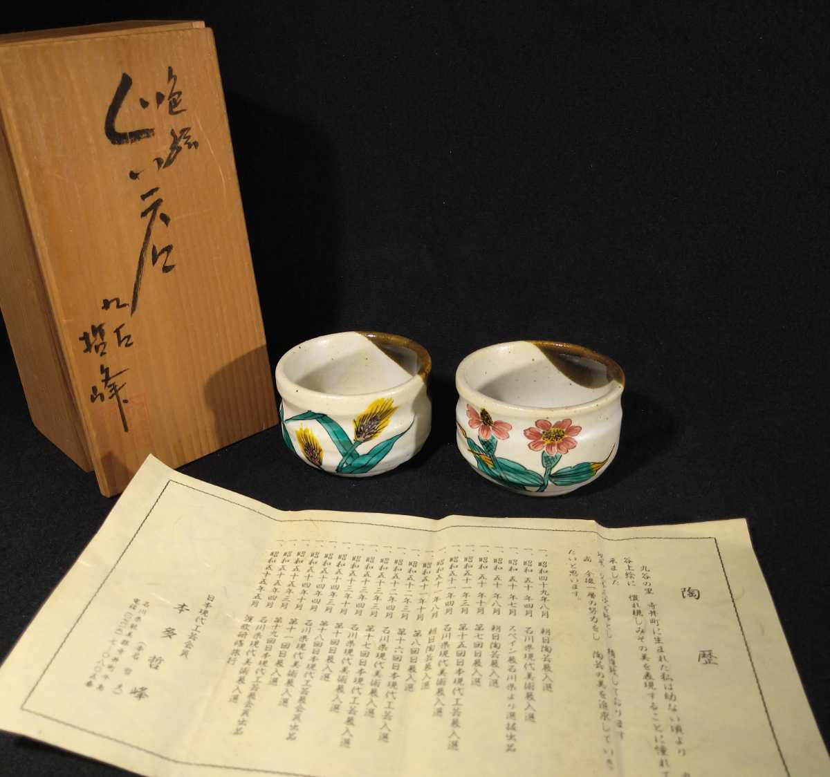 > 本多哲峰 「色絵ぐい呑」 色絵 花文 ぐい呑 2客組 共箱 九谷焼 酒盃 酒器 a-09i186