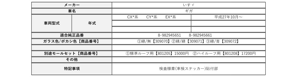 - 1◇新品◇UV&IRカット断熱フロントガラス◇イスズ ギガ H27.10- CX*系 CY*系 EX*系 ボカシ無 ボカシ緑 ボカシ青 309070 309071 309072