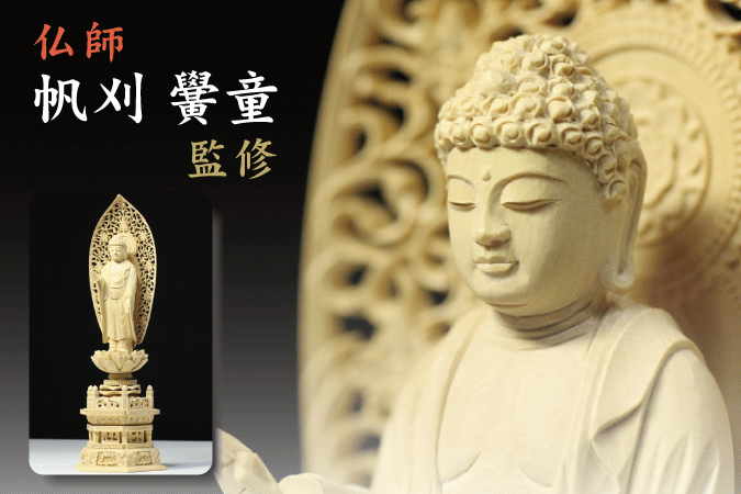 > 仏像 ■ 3.5寸 ■ 阿弥陀如来立像 六角台座 総柘植 浄土宗 ご本尊 ■ 仏具 (高さ27.2cm×幅10.2cm×奥行き7.6cm)