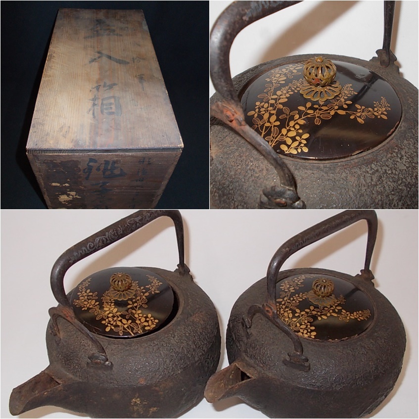 - 屠蘇器 一対 鉄瓶 金蒔絵蓋 蔦紋 銚子 草花 明治期 燗鍋 茶道具