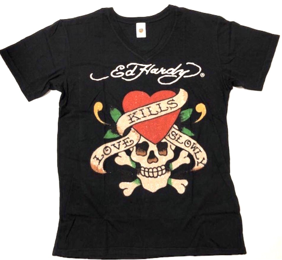 > 【未使用品、豪華版、正規品、本物】 Ed Hardy エド ハーディー ラインストーン Tシャツ ラブキルズ サイズM ブラック
