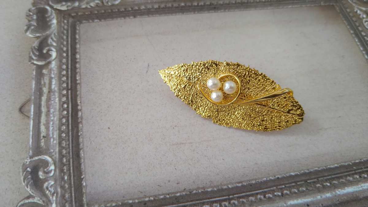 - □ゴールドカラー×透かし模様・リーフモチーフ&パールビジュー・ブローチ□
