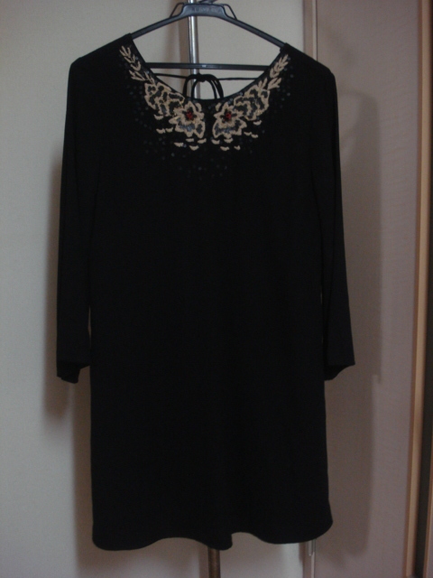 - 格安ガーリー可愛い・ZARA(ザラ)・お洒落な黒系(又は濃紺系)ジョーゼット風地?・襟部花柄刺繍&ネックレス風デコ付き高級長袖ワンピース M位