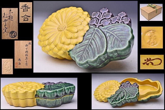 > 泉喜仙 ★ 大樋松雲 窯 ★ 色絵 菊桐文 香合 ★ 共箱 書付箱 ★ 作品:花押在印 ★ 交趾焼 ★ 御下賜銘菓之意 ★