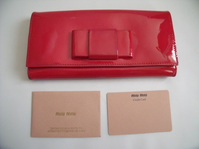- $ 美品 $ ◆ ミュウミュウ ◆ miumiu ◆ リボン モチーフ ・ エナメル レザー 長財布 ◆ ピンク レッド系 ◆ 送料無料!!