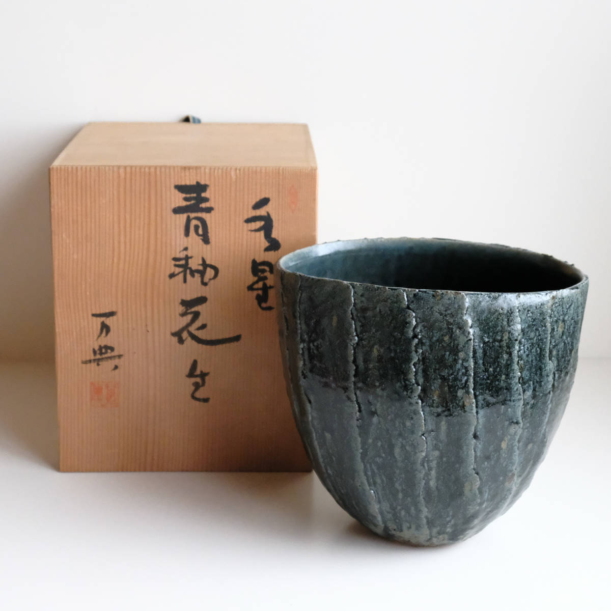 - 戸松万典 青和花生 共箱 花器 華道 花生け 花瓶