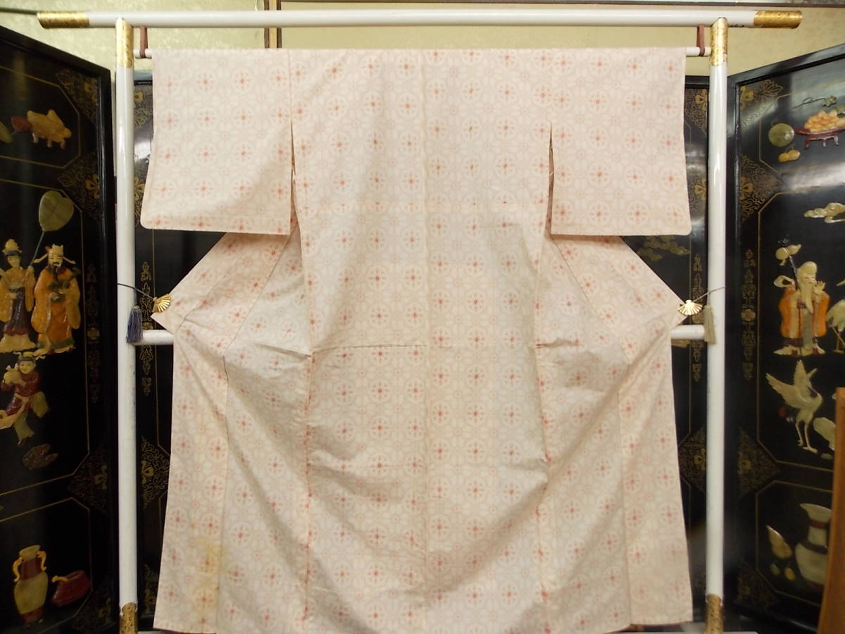 > きもの今昔2982 夏の100円バーゲン 紬のきもの バチ衿胴抜き八掛付き仕立て 白地赤絣柄