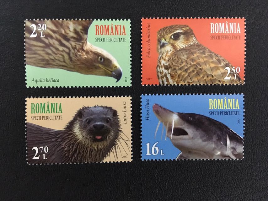 - ルーマニア 2017年 オオチョウザメ カワウソ ハヤブサの一種 カタシロワシ 鳥 魚 4種完 未使用 NH