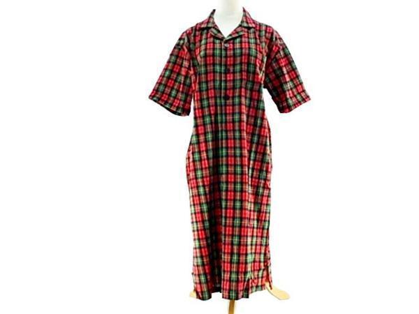 - ルームウェア シャツワンピ 綿100% 5分袖 家事 寝間着 涼しげ トールサイズ Lサイズ チェック柄 レッド系