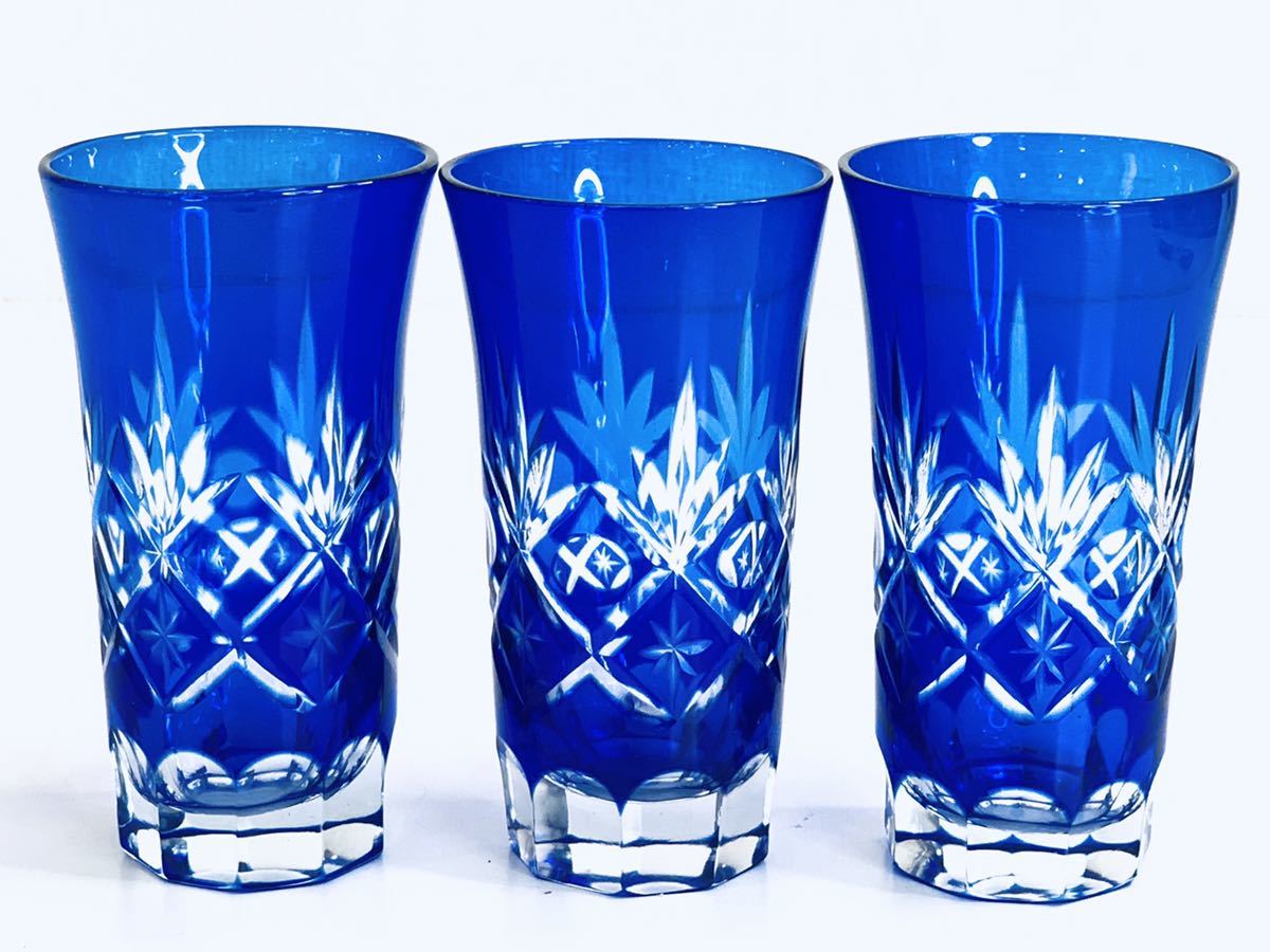 - 60▼ 切子グラス 一口ビールグラス 切子ガラス 和食器 青 硝子 3客揃 美品管理2201 D-17