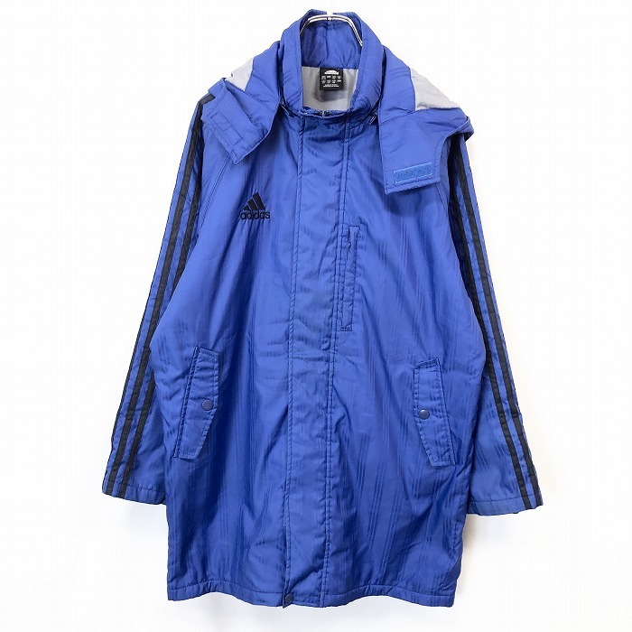 > adidas アディダス 150 キッズ ジュニア 若干薄手 中綿 ハーフコート ジャケット フード脱着可 ストライプ ラグラン 長袖 ポリ100% 青