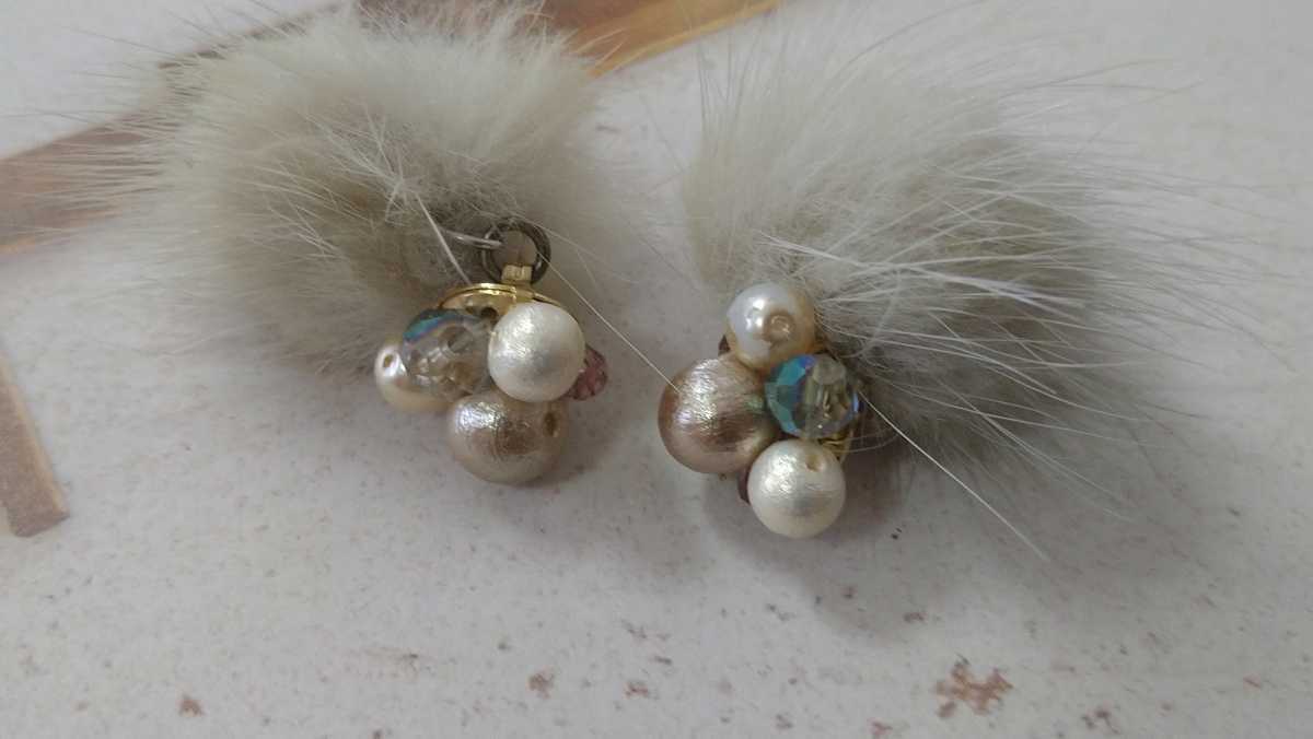 - □訳あり□グレー系ファー×パールビーズ・ピアス□