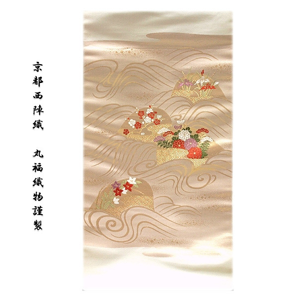 > [和楽屋] 訳あり■京都西陣織 「丸福織物謹製」 煌びやかで豪華な 山雲 四季花 正絹 九寸 名古屋帯■
