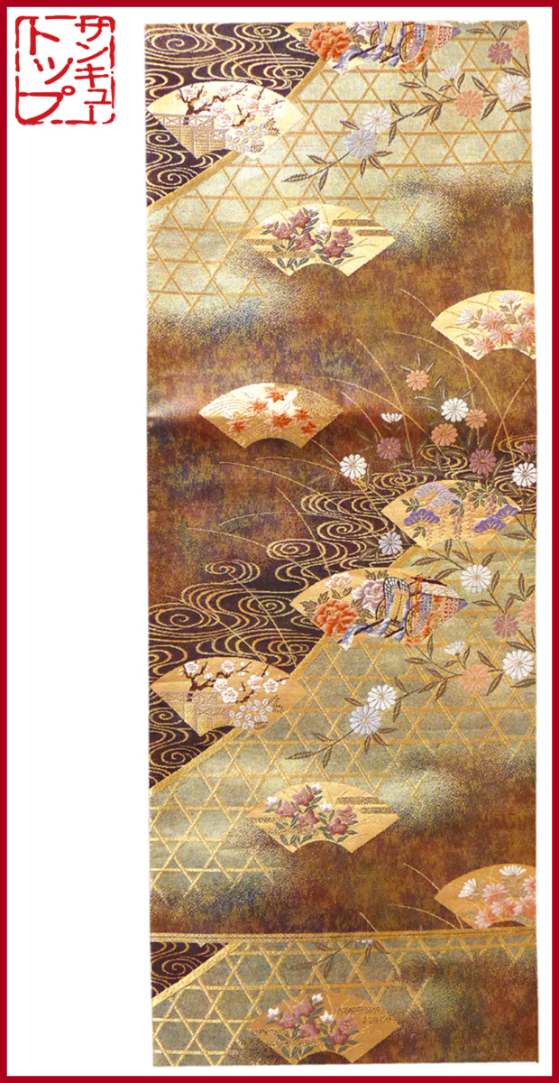 - 【店頭価格12000円の品 在庫処分 大幅値下げ】☆質:39トップ 着物館 帯 854 正絹 袋帯 六通 桧垣扇面文様 中古 お慶びの席に