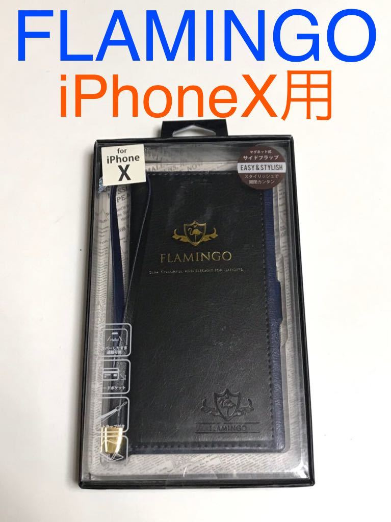 匿名送料込 iPhoneX用カバー 手帳型ケース FLAMINGO ブラック×ブルー 黒青色カードポケット ストラップ新品 アイホン10 アイフォーンX/IZ7