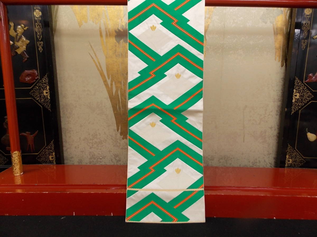 > きもの今昔3328 夏の100円バーゲン 袋帯 西陣織正絹若松の銀地緑の松皮菱