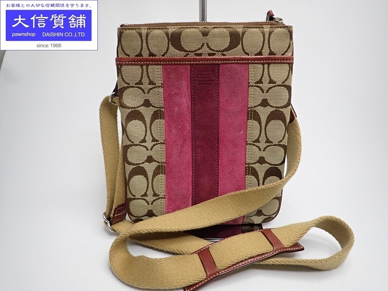 - COACH コーチ シグネチャー ショルダーバッグ クロスボディ ベージュキャンバスxストライプパープルスエード 中古B 【送料無料】 A-7067