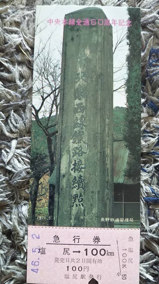 - 0303-39【国鉄記念きっぷ】中央本線全通60周年記念急行券 塩尻→100km 昭和46年