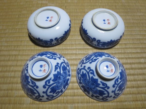 - 食器 セット 茶碗+小鉢 各2個 牡丹 唐草 藍色 青 ブルー 不老哲山