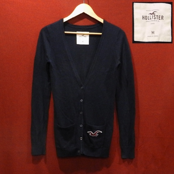 > HOLLISTER ホリスター コットン ビスコース ロゴ パッチ 薄手 ニット カーディガン 紺 レディース M サイズ