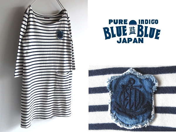 > BLUE BLUE ブルーブルー インディゴデニムロゴワッペン 片側ポケット コットン ボーダー ボートネック ワンピース FREE ネイビー ホワイト