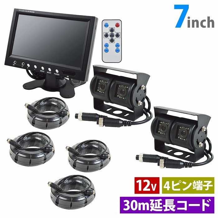 > 【7点セット】ノイズ防止配線 4画面 7インチ オンダッシュモニター + 暗視 LED CCD ツインレンズカメラ2個set 30m 延長ケーブル付