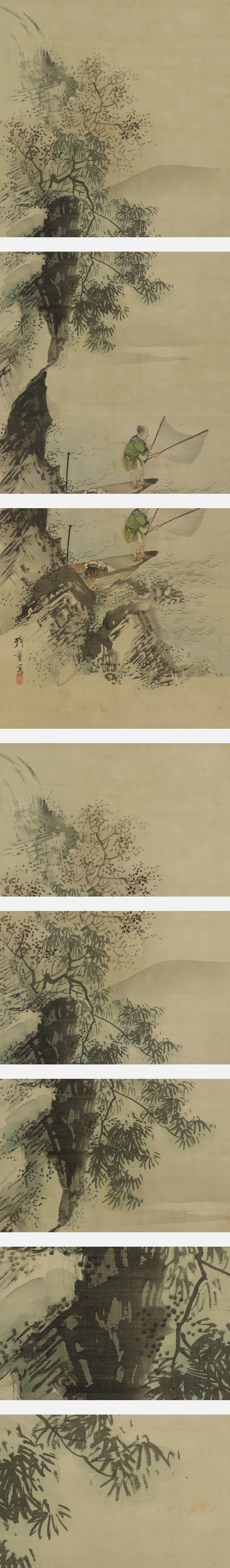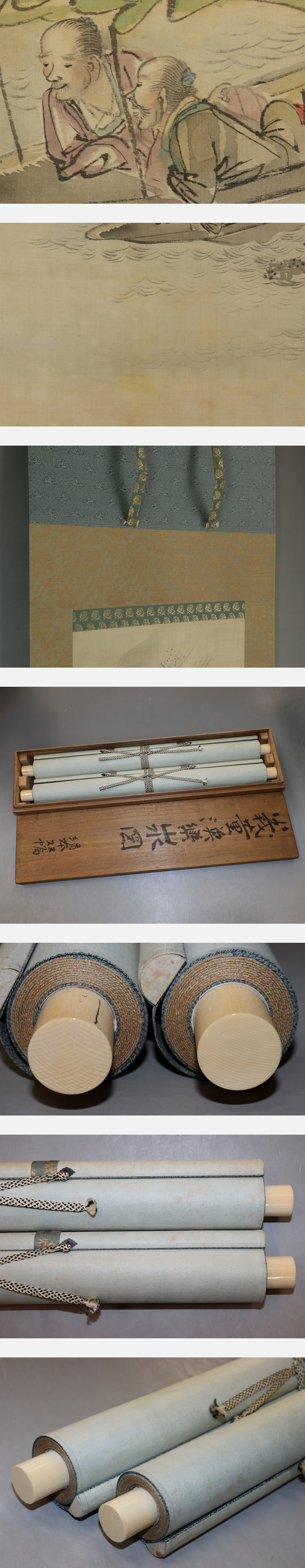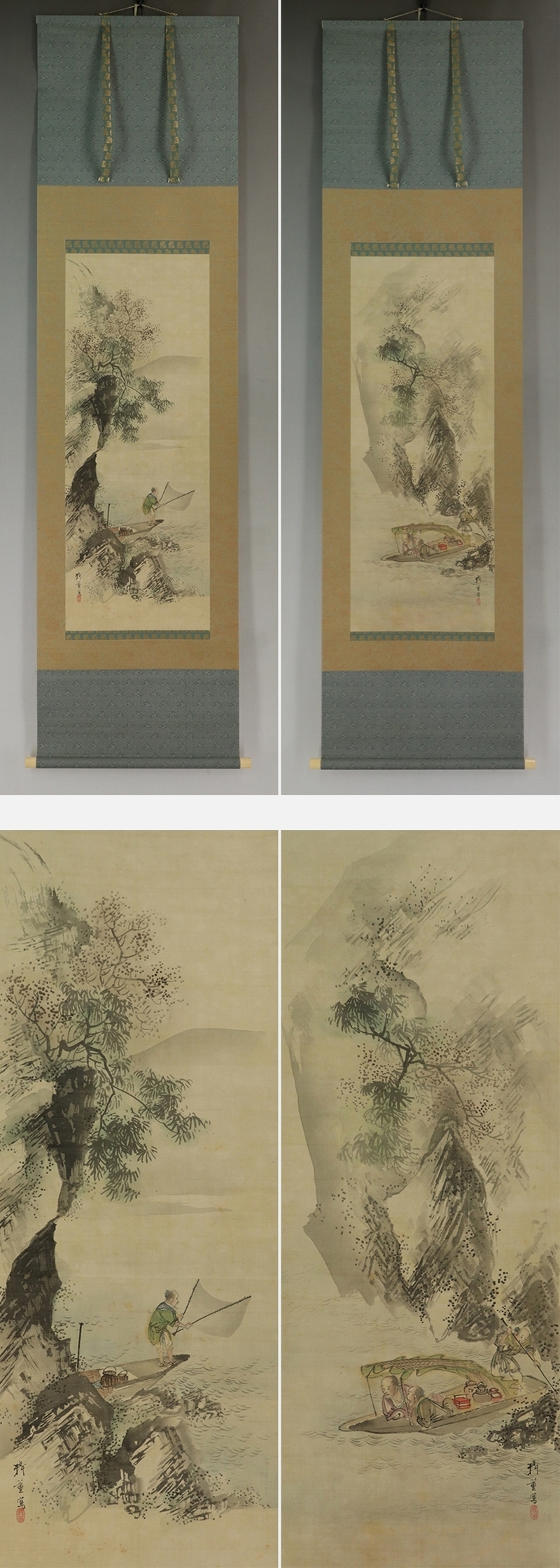 - 【真作】柴田義董【双幅・漁楽山水図】◆絹本◆合箱◆掛軸 u03105