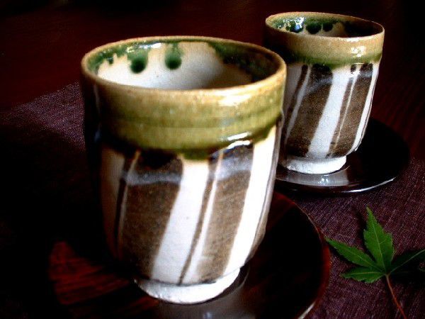 - 湯呑み 青織部 縦縞文 夫婦 湯呑み 野々村浩司 NO-27