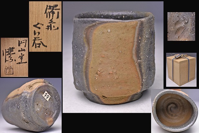 > 金重まこと ★ 備前 ぐい呑 ★ 共箱 ★ 上作 ★ 父:金重素山 / 叔父 人間国宝 金重陶陽 ★ 独特の歪みに牡丹餅が見事な景色 ★検 金重有邦