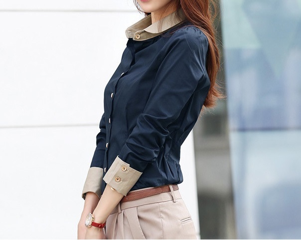 - nana56b-i-.[春秋 長袖 スリム シャツ 2色 ダークブルー+ベージュ ブラウス]カジュアル