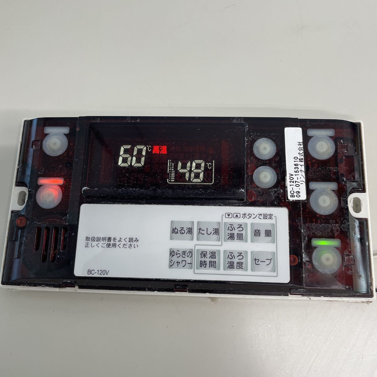 > (445) Rinnai リンナイ 給湯器リモコン BC-120V 有線リモコン 住宅設備 通電確認済み 動作未確認 中古 ジャンク品【表面カバー欠品】