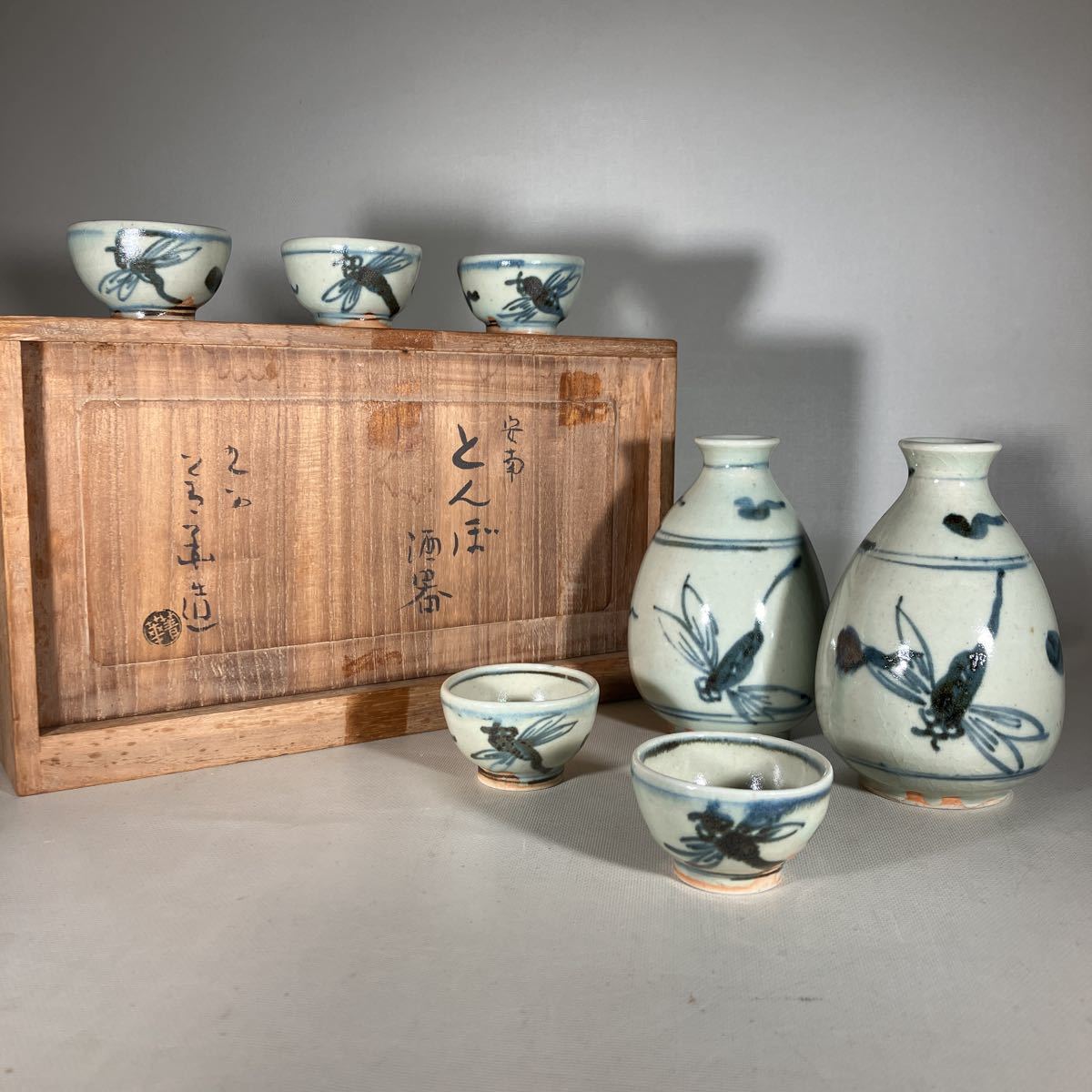 - 須田菁華造 安南とんぼ酒器 揃い 共箱 茶道具 徳利 九谷 九谷焼 猪口 酒道 888
