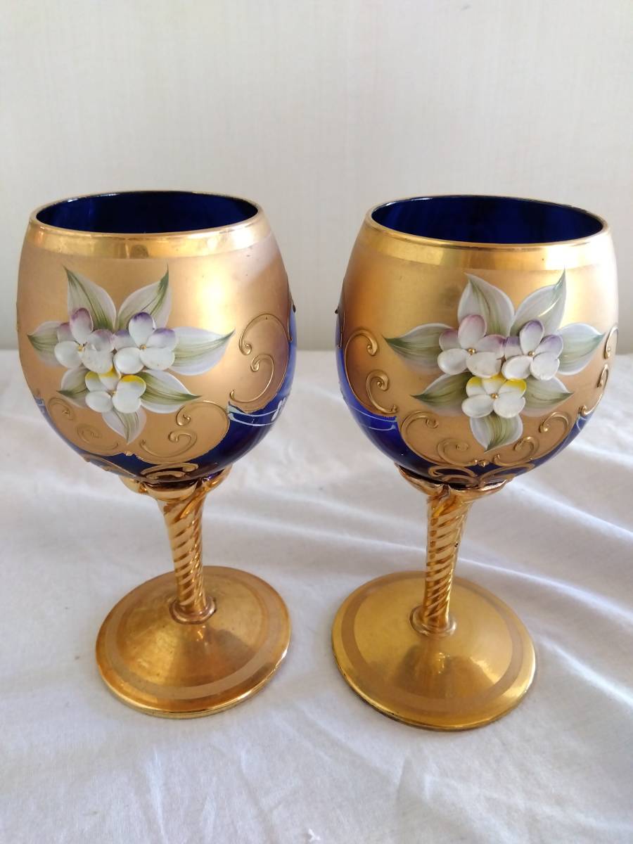 - ベネチアングラス ワイングラス 金彩ブルー 青 ペア 訳アリ レトロ 未使用