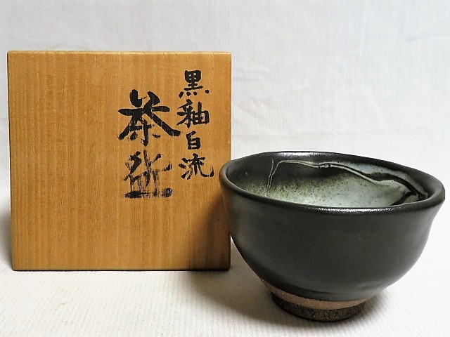 - 茶道具 黒釉白流 茶碗 人間国宝 清水卯一 共箱