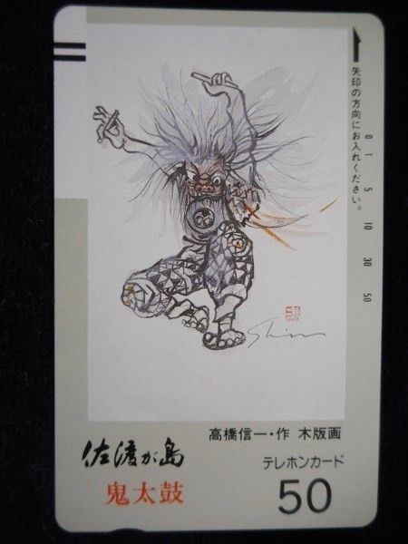 - テレカ 50度 佐渡ヶ島 鬼太鼓 高橋信一 木版画 T-1143 未使用