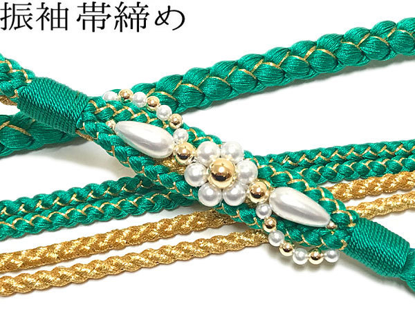 - 帯締め 振袖 緑系 金 パール 正絹 手組み T-no,15 成人式 振袖 礼装 結婚式 婚礼 おびしめ 振袖小物 着付け小物 メール便 送料無料